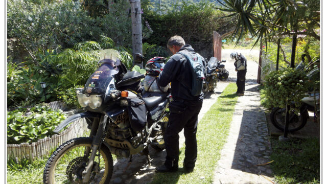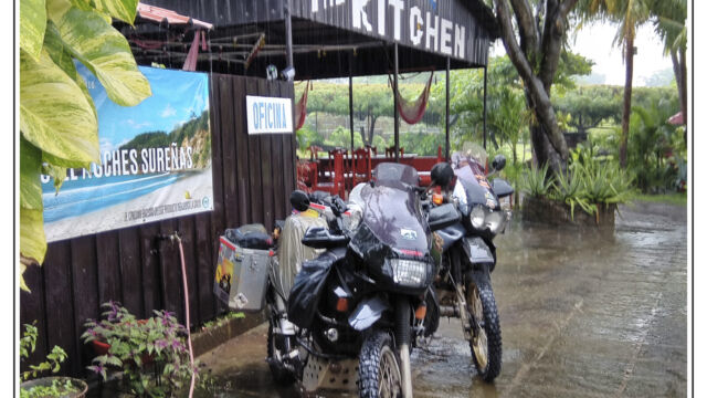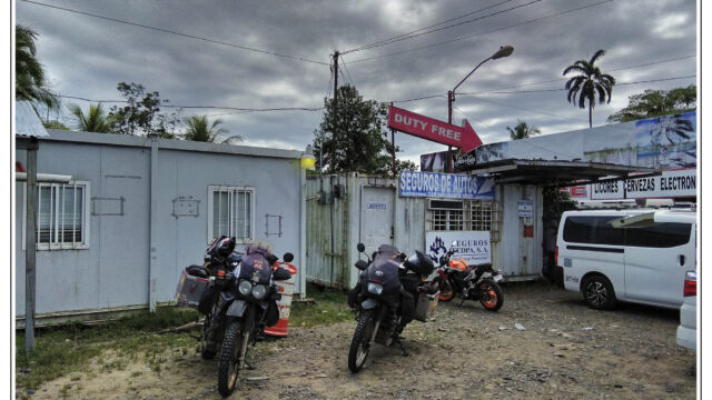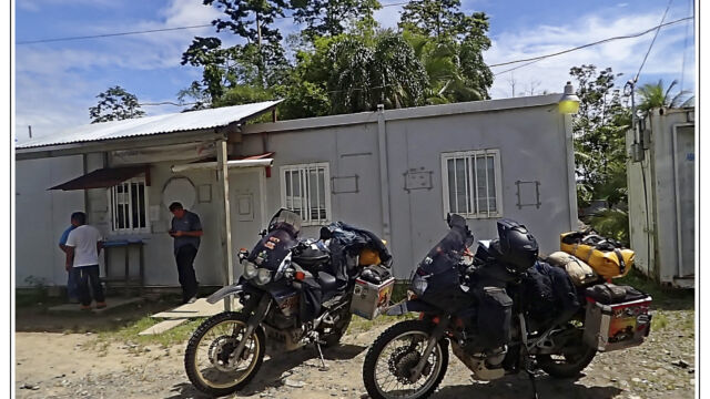 Boris was our agent on the Panama side. His dad, “Papa Boris”, arrived at the meeting point and the rain stopped when we were driving over to the port area. We found our way in a convoy (two more cars were sharing another container) on this gravel area full of rain filled potholes trucks and trash. Finally we were all parking around the two containers. Papa Boris told us that we probably need to take off all four panniers to make it fit. Hmmm not nice but well… There was no dry or clean area to put anything and we always have to unpack the pannier to take it off. So it was a bit off a challenge to sort everything. Of course meanwhile the sun was out, it became immediately hot and we were sweated in a second. Our container buddies allowed us to store all our `loose´ things in their cars – THANK YOU ALL SO MUCH FOR THAT AGAIN!!! As a precaution we organized some big rubbish bags where we `sealed in´ all our sweated gears and boots not to `contaminating´ the cars of our buddies ;) So far so good! On arrival we identified with the pre-bill of lading the correct container together with Papa Boris and an hour later they started to load the wrong car (one of the other group with the second container) into our container while we were sorting our things. Luckily Sascha saw it and so they had to unload it again… puhhh! Additional Papa Boris is suddenly mentioning that our two motorcycles might not fit in the container as they are really big… ????!!!!???? WHAT??? We gave all our measurements upfront to them from the beginning – even the width with the panniers on. So we told him there is no question about putting maybe one bike in the other container. They HAVE to fit!