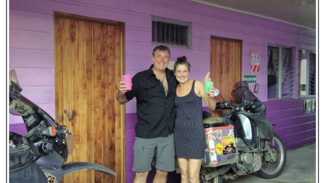 The loading was a sweaty act. Kerstin’s bike they dropped once with the front wheel in the space between the loading truck and the container. It plunged hard on the fork – uffff. We had to fit the bikes in on the main-stand. Sascha did not like that idea at all but there was no other way and finally we fit them and strapped everything as best as possible – DONE. Let´s hope they will arrive in one piece and still standing…