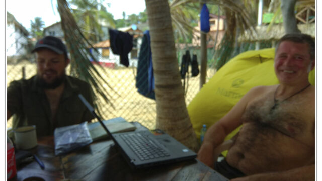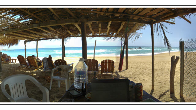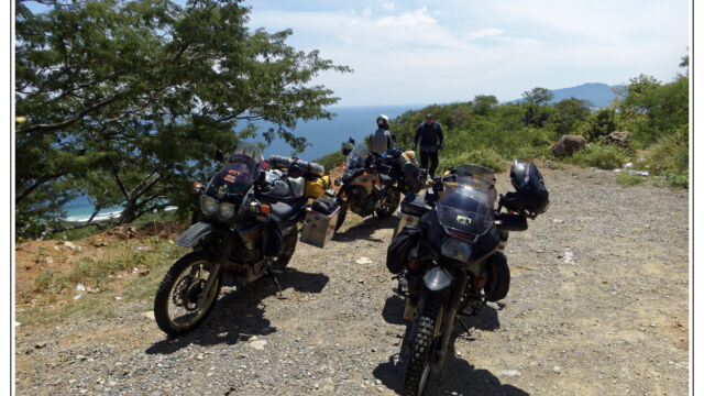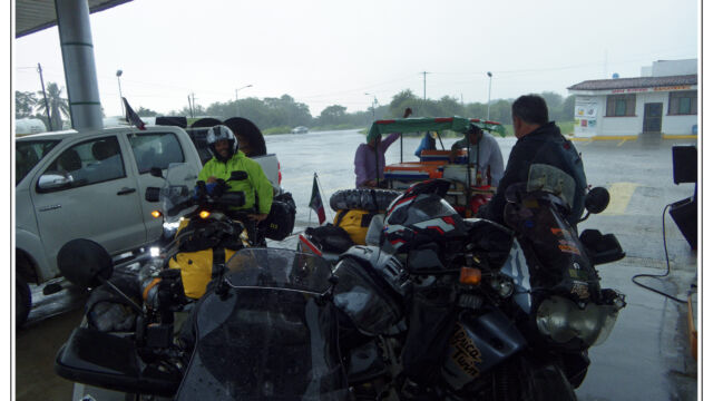 Down at the pacific coast we finally met Jason, a Canadian guy. We are in contact with him already since Baja but we never met so far. Two days beach, swimming, chatting and then we left together towards San Cristobal. The stretch was too long for one day ride and just before we reached the destination for that day a thunderstorm caught us. We found shelter under a gas station roof with many others for nearly an hour until we could make our last 30 km for that day.