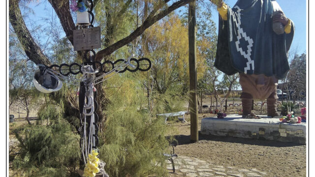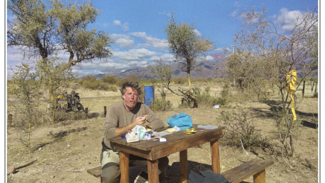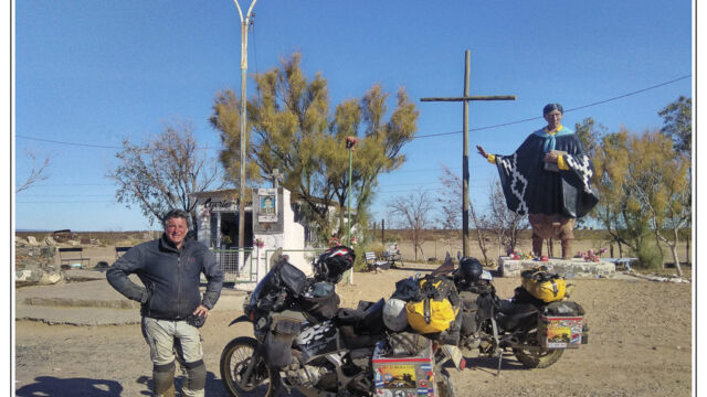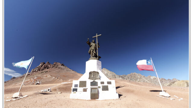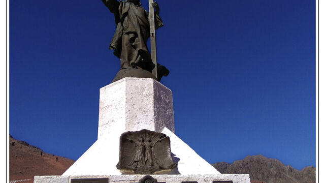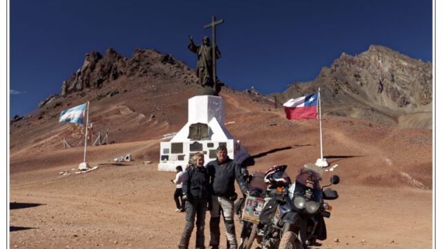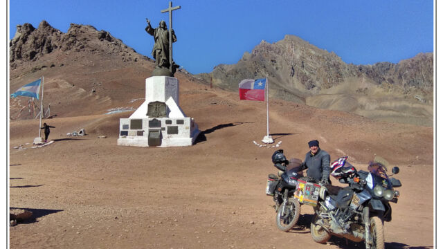 On Easter Sunday we thought it is a good opportunity to ride a last time up an Andes Pass. El Paso Sistema Cristo Redentor connects Mendoza in Argentina with Santiago in Chile. Shortly before you cross the border you can ride up a steep sandy dirt road to “Christ the Redeemer of the Andes”; the road climbs 1 km over a sinuous 9 km from Las Cuevas to the pass. It is a monument high in the Andes at 3,832 meters and unveiled on 13 March 1904 as a celebration of the peaceful resolution of the border dispute between the two countries. We had a great day and ride except one drop of bitterness: while riding uphill behind a stinky slow truck for a while we overtook though two solid yellow lines… and guess what! Yep the police was just waiting for us uphill around the corner. We each got a ticket over 170 Dollar – AUTSCH! We could not talk us out and while we tried they caught another Motorcyclist… That was an expensive Easter-trip and Kerstin received her first ticked of her life in Argentina hey!